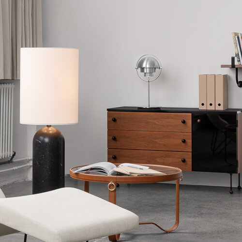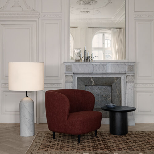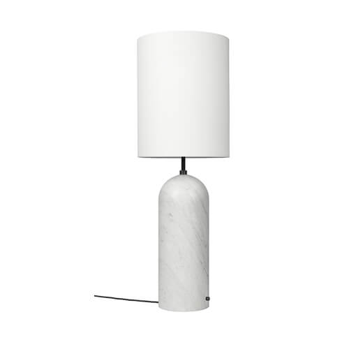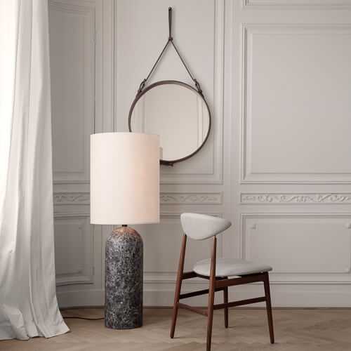 Vil du have loungestemning, klassisk look og kvalitet, så er Gravity gulvlampen et godt bud. Designet for danske Gubi af det dygtige Space Copenhagen team. Perfekt balance mellem materialerne: marmor og stof. Netop fordi marmor er et naturmateriale, så kan udtrykket stifte fra lampe til lampe, men netop det gør den også unik - Klassisk og smuk.