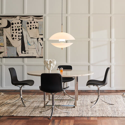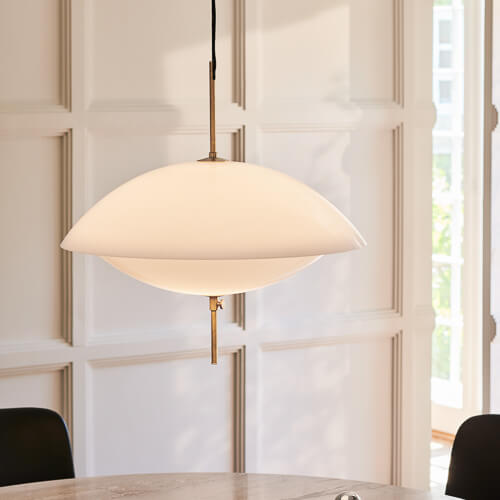 Lampen er kompleks at fremstille, da de mundblæste glasskærme skal passer perfekt i forhold til symmetri og vægt, dette er i sig selv en udfordring for selv de mest erfarne glaspustere. Men designerne går ikke på kompromis og det er der kommet et helt perfekt, smukt og gennemtænkt produkt ud af.
