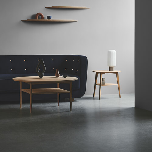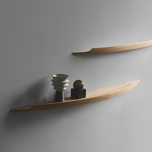 Arcus Shelf er designet af Nanna Aakjær Svendsen, inspireret af hendes morfar Jørgen Aakjær Jørgensen. Nanna ønskede, ligesom med morfarens sofaborde, at skabe et design som kan stå alene, det er så rent i designet og alligevel skulpturelt at det kan minde om et kunstværk. En af detaljerne som Nanna bl.a. har som reference til morfarens design, er den klassiske kehletkant, som kan ses på flere af morfarens sofaborde op gennem 50erne og 60erne. Kanten har fået en ny funktion, som en smuk afslutning på hylderne. Hyldernes organiske form gør dem til en naturlig del af væggen, når de hænges op.