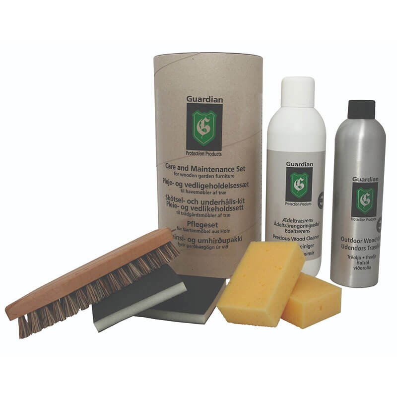 Guardian Plejesæt til træhavemøbler er lige det du mangler, når dine havemøbler skal renses og gøres klar til sommermånederne. Sættet består bl.a af træolie, ædeltræsrens, svampe, en børste og andre produkter som er velegnede til pleje og vedligeholdelse af udendørs træmøbler, så du har mulighed for at give din terrasse, altan eller have helt nyt liv med møbler, som ser både sunde og stærke ud.