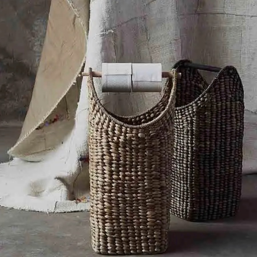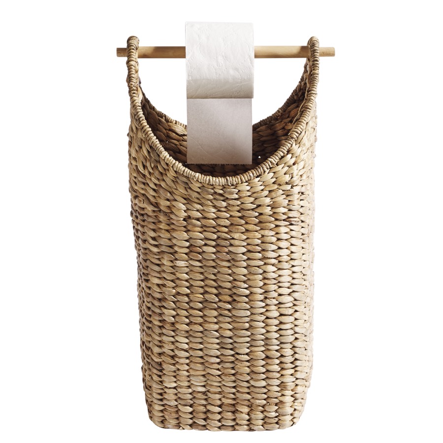 Høj kurv håndlavet i vand hyacint. Kender du ikke det, at gæsterne skal lede efter en toiletrulle, nu kan du på en smart måde have alle dine ruller liggende fremme i kurven. Både smukt og dekorativt. Håndtaget virker som toiletrulleholder. Kurven kan også med fordel bruges til plaider eller andre tekstiler, eller som en rummelig kurv til strikketøj.