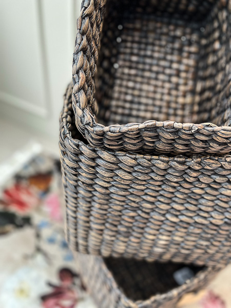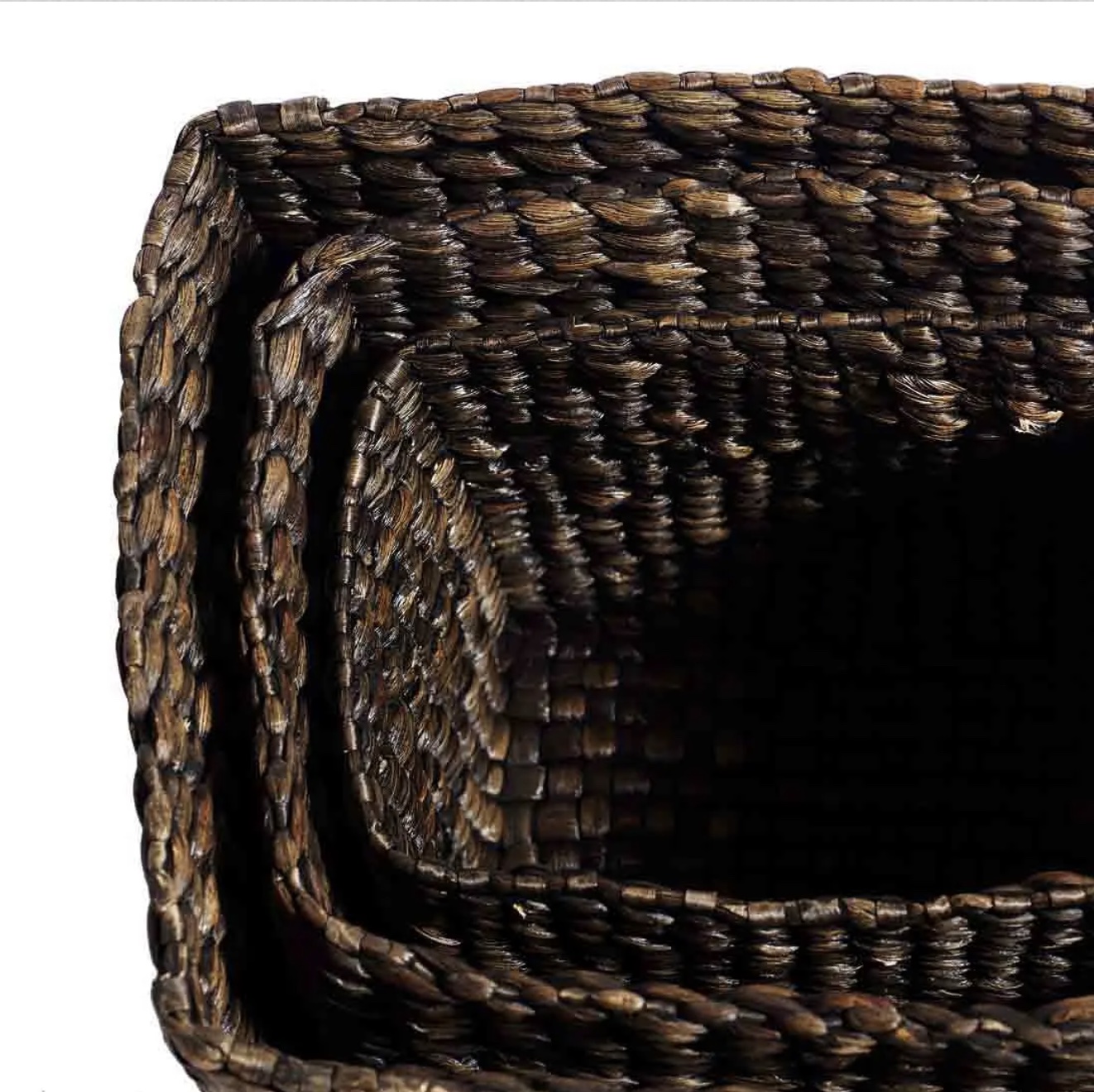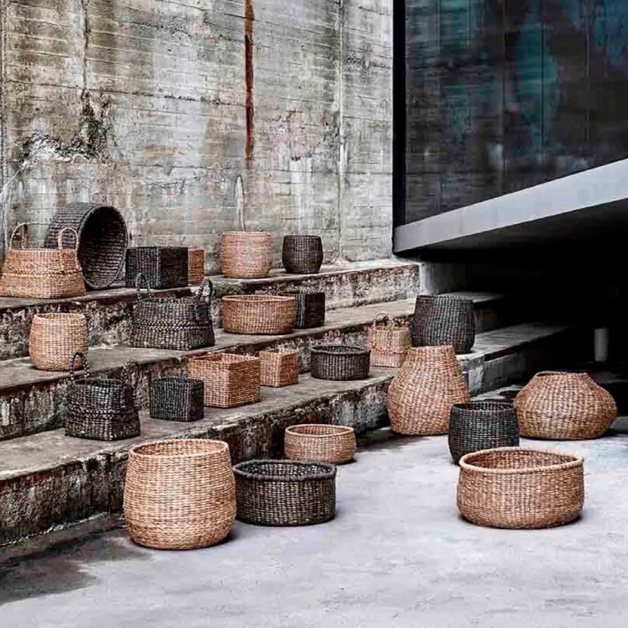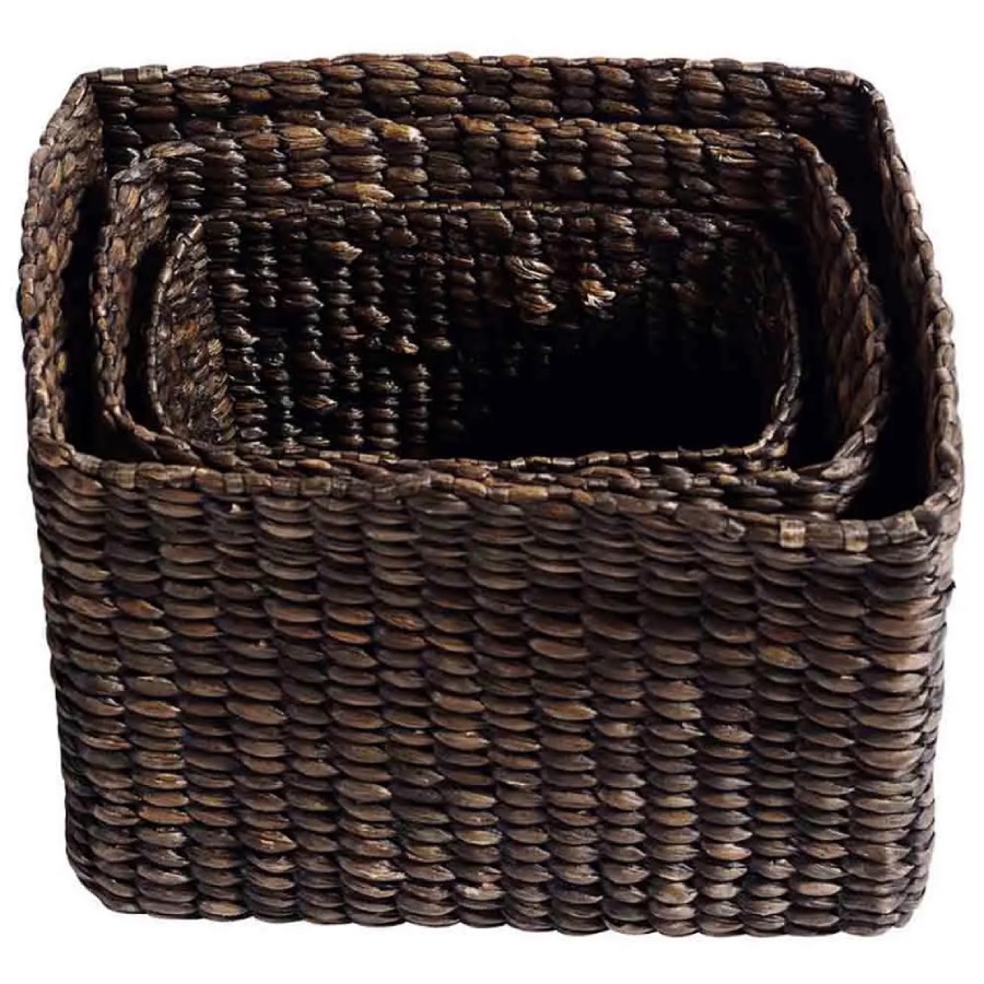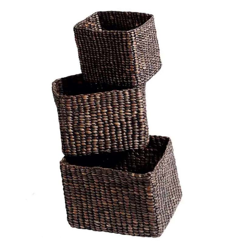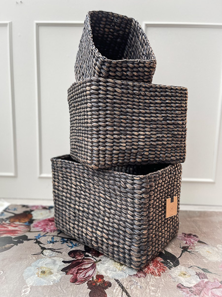 Firkantede kurve i håndvævet vandhyacint. De naturligt farvede kurve kommer i tre funktionelle størrelser, som kan opbevares indeni hinanden, så snart de ikke er i brug. Brug fletkurvene til at opbevare alt fra toiletruller, håndklæder, strikketøj eller legetøj. Eller hvad du nu lige mangler en smuk opbevaring til.