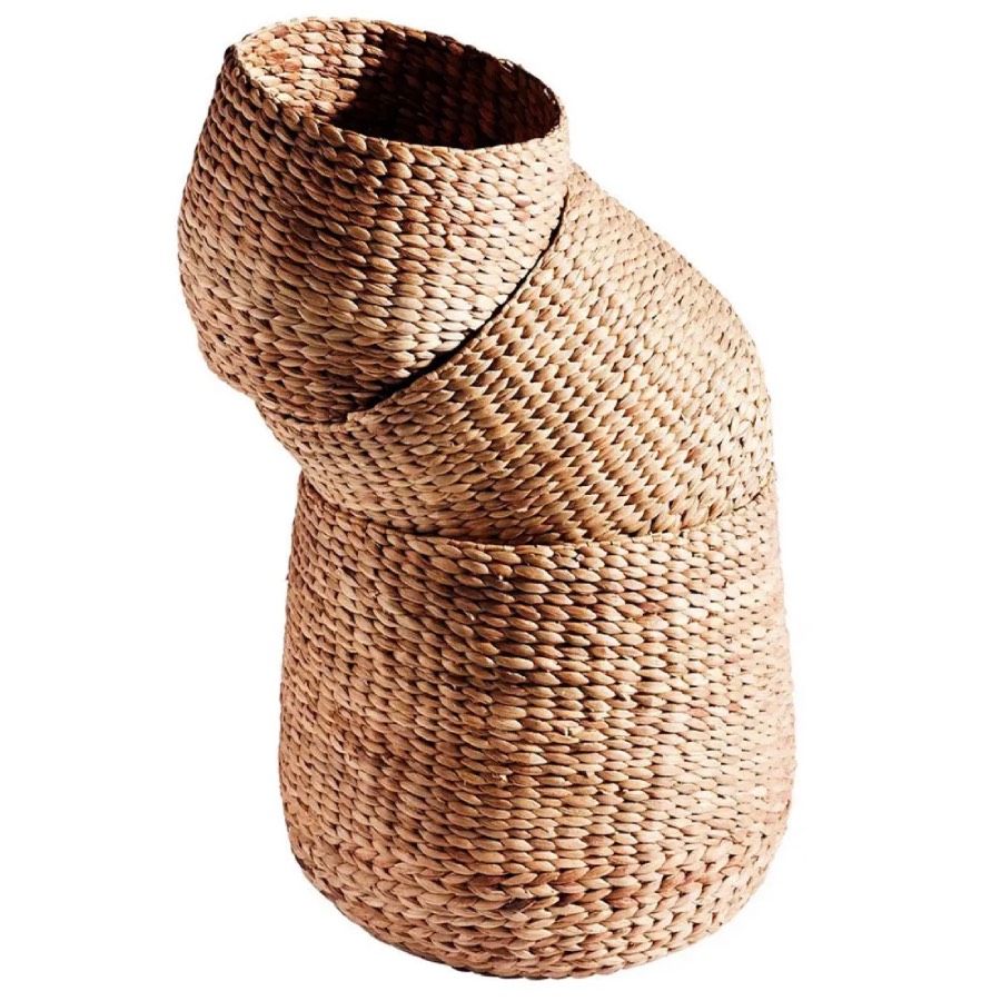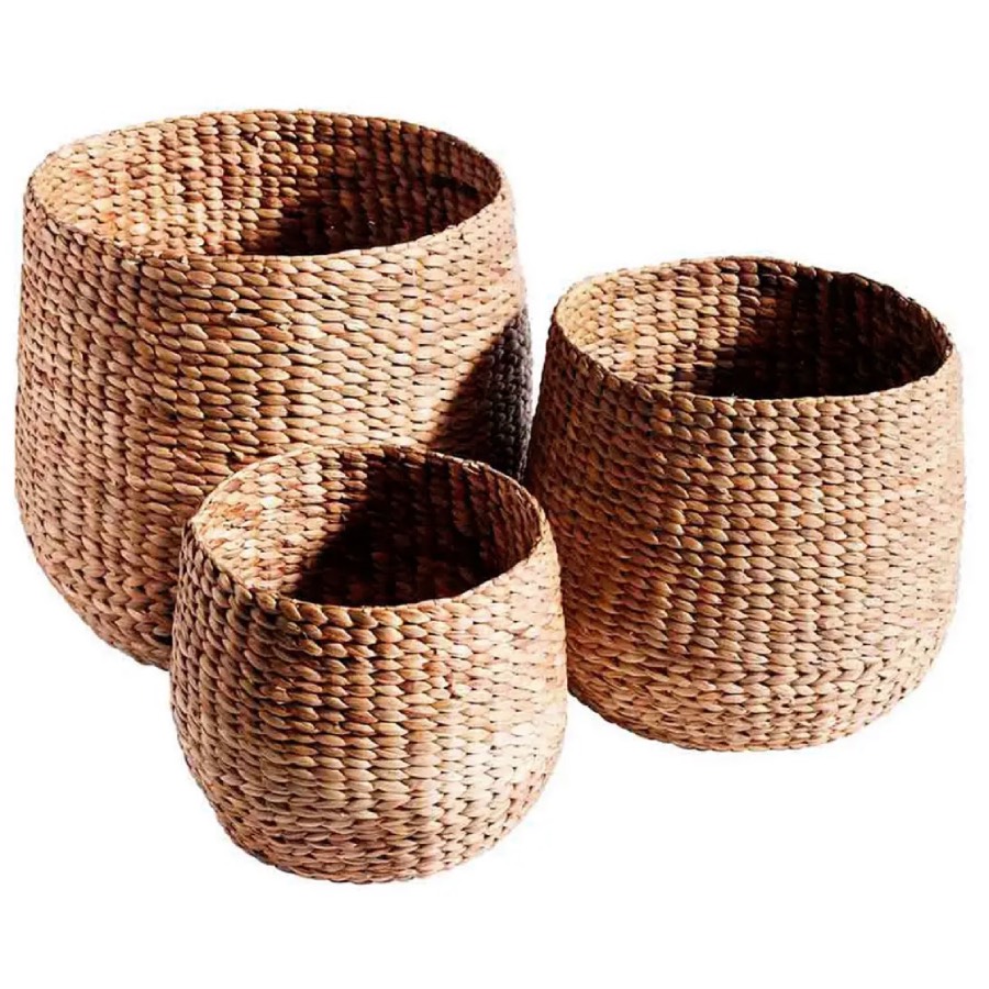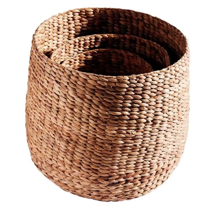 Runde kurve i håndvævet vandhyacint. De naturligt farvede kurve kommer i tre funktionelle størrelser, som kan opbevares indeni hinanden, så snart de ikke er i brug. Brug fletkurvene til at opbevare alt fra toiletruller, håndklæder, strikketøj eller legetøj. Eller hvad du nu lige mangler en smuk opbevaring til.