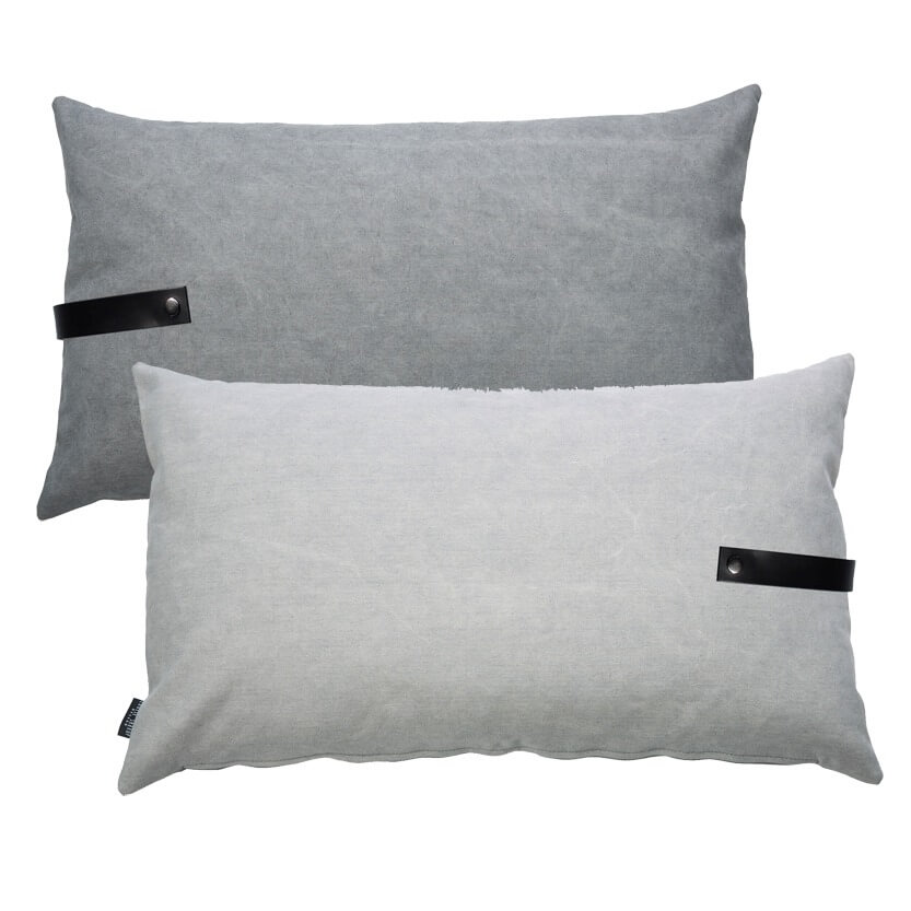 Puden er lysegrå på den ene side og mørkegrå på den anden. Dertil har puden en kernelæder strop og fyldet består af 100 % dun.