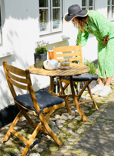 Det lille cafesæts trumf i ærmet er dens fleksibilitet. Det kan nemt flyttes rundt efter læ, efter sol, efter skygge. Se med her >