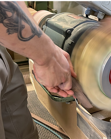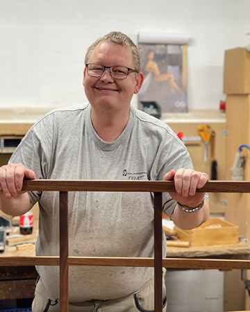 Og mennesket er stadig den afgørende faktor. F.eks. hvis den person, der har sorteret træet, har valgt det forkerte til et bestemt møbel, så er der ikke noget, man kan gøre ved det bagefter, selv om de er nok så dygtige til at forarbejde det. Så forestil dig, at du allerede i starten af processen skal pege på det helt rigtige (store) stykke træ og kunne se, at præcis det træ vil være grundlaget for et nøjagtigt givent møbel. Det er da professionel akkuratesse, viden og “hovedet på blokken”. Men det VED DE.