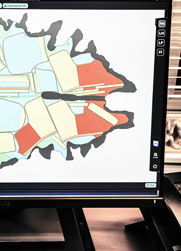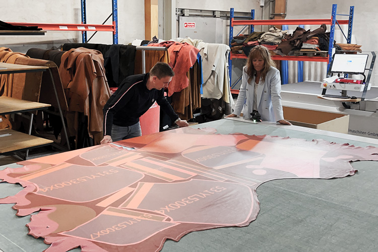 Imponerende højteknologisk. Læderet scannes og lagres i hukommelsen. Maskinen placerer skabelonen på møblet, mest optimalt på læderet, så unødig læderspild forekommer. Dernæst skæres, helt perfekt, skabelondelene ud. Der er ingen slinger i valsen, det hele er til perfektion og helt nøjagtigt.