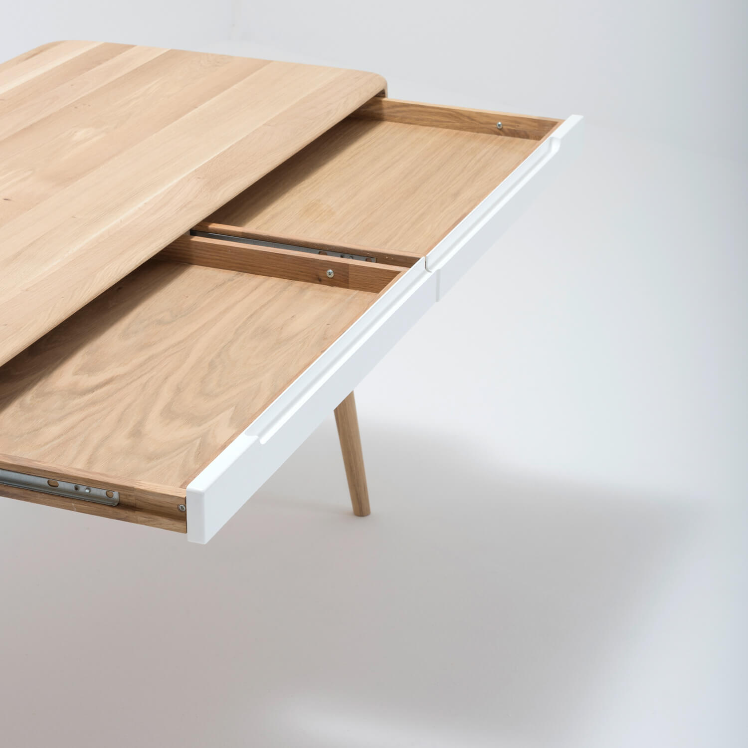 Fremstillet i massiv egetræ med 2 malet skuffer.