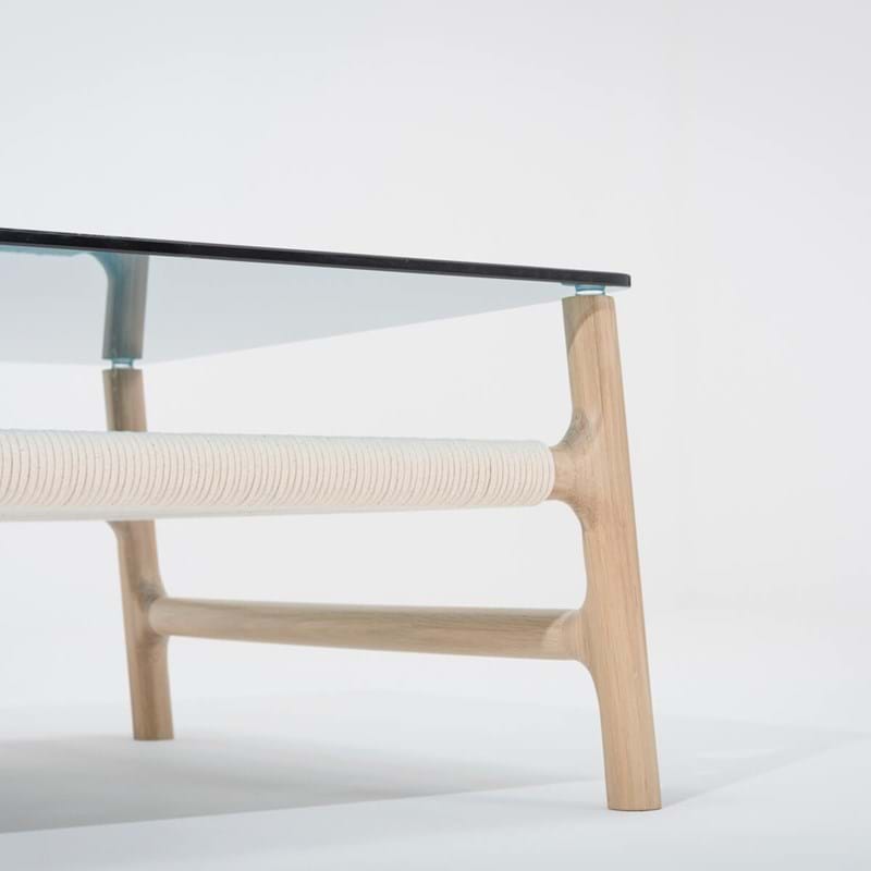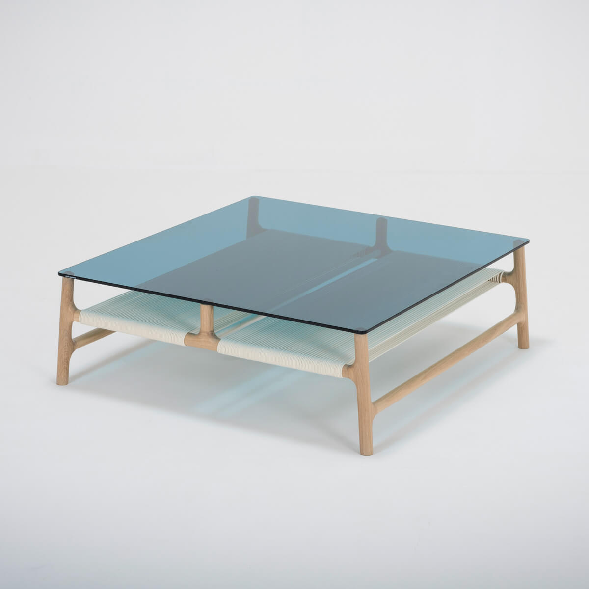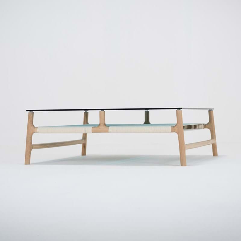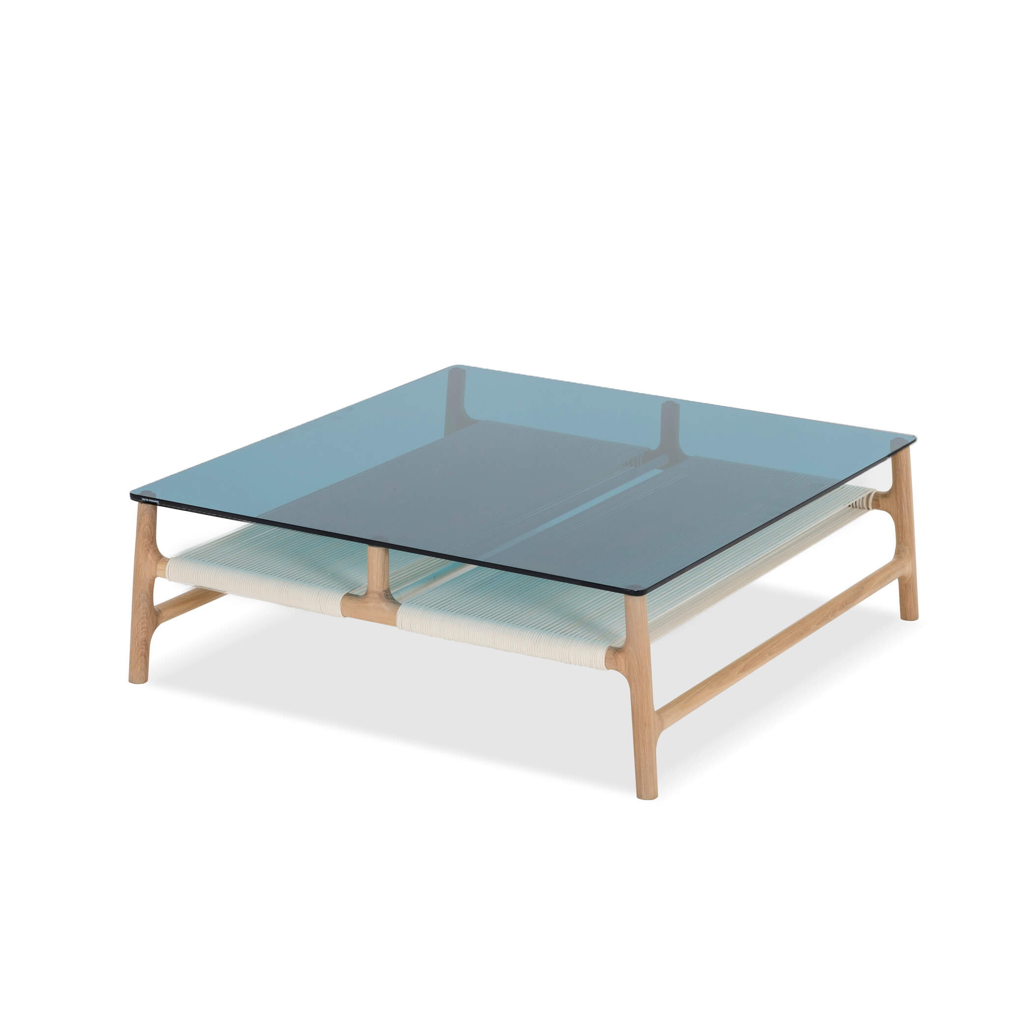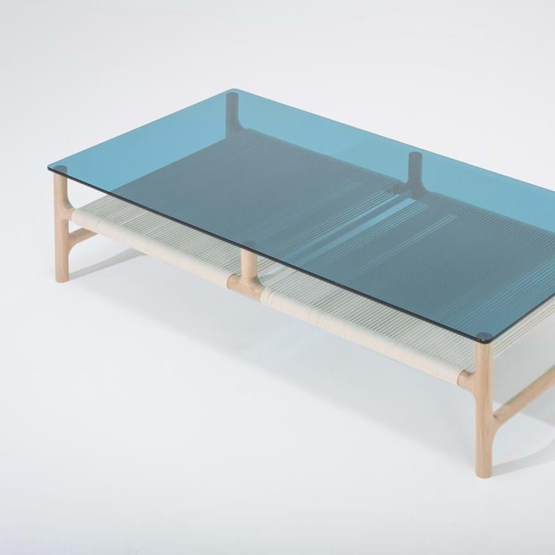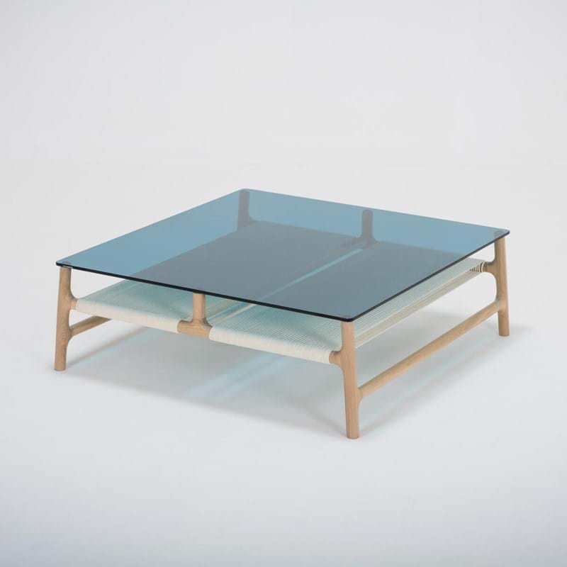 Fawn sofabord i massiv egetræ med glasplade i petrol.