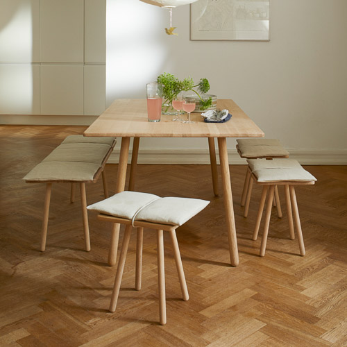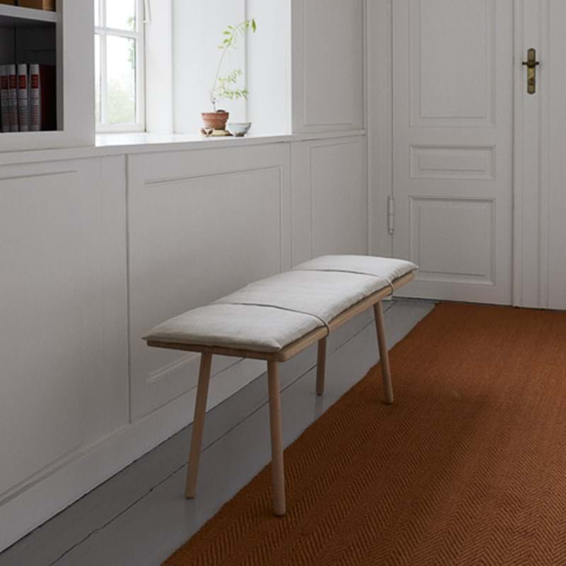 Georg bænken udbyder et fantastiske møde mellem den japanske minimalisme og nordiske sensualitet. Bænken består af de slanke ben med afrundede kanter, som er fremstillet i egetræ. En flettet læderrem holder på den bløde uldpude, der udgør komfort i bænken. Den flotte bænk vil være et perfekt møbel til entréen og garderoben, hvor du har brug for et sted at sidde, når der skal sko og støvler på, eller måske ved spisebordet som en dejlig siddeplads rundt om samlingsstedet.