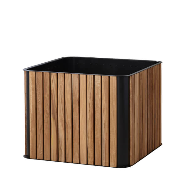 Her ses den lave plantekasse fra Combine-serien. Combine-serien klassificeres ved, som navnet også hentyder til, at blande materialer på en ny og kreativ måde. Combine plantekasserne har et super moderne look med den flotte blanding af teaktræ og aluminium der giver et minimalistisk og meget stilet udtryk. Combine-serien passer perfekt ind i den moderne husstand og er en fed måde at sætte et ekstra design præg på jeres udendørsareal.