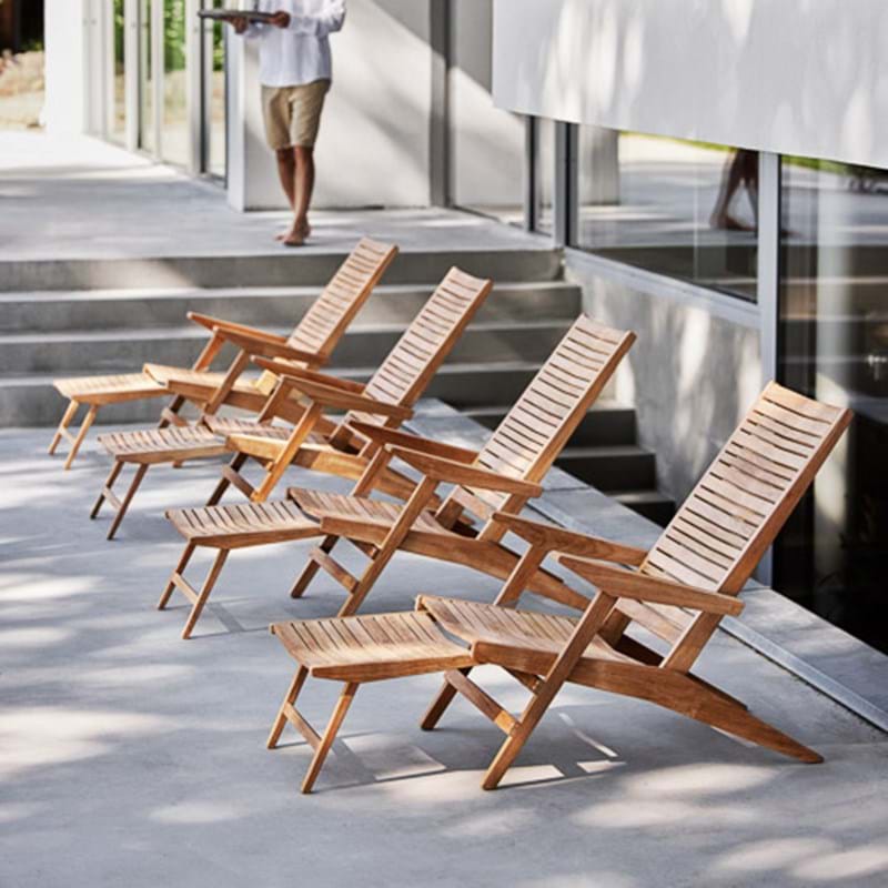 Denne smukke og praktiske dækstol er en skøn tilføjelse til Flip serien som også består af bl.a. lavryggede stole. Flipstolen har en justerbar ryg og en integreret fodskammel der kan skubbes ind under sædet, når den ikke er i brug. Smart detalje, fordi du slipper for en løs fodskammel der står og fylder. Flip er udarbejdet i høj kvalitets Grade A teak, som giver en varm glød, men som også betyder at teak er fældet under SVLK certificeringssystem, som sikrer at teakproduktionen støtter ansvarligt skovbrug.