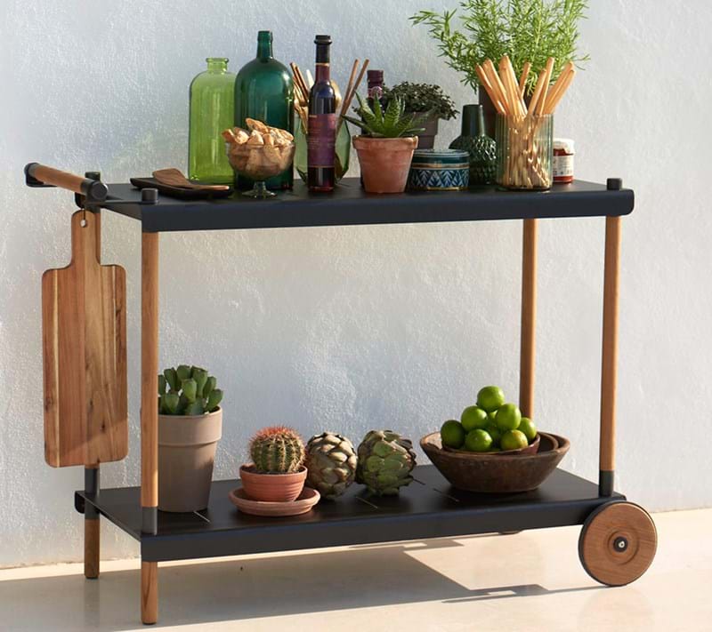 Frame serveringsvogn er designet og fremstillet af Cane-line selv. Serveringsvognen har med sit flotte aluminium og teak design en helt bestemt charme over sig. Serveringsvognen kan takket være valget af materialer både anvendes inden- og udendørs, og kan uden problemer anvendes udelukkende som havemøbel da det er designet til at kunne stå ude hele året.