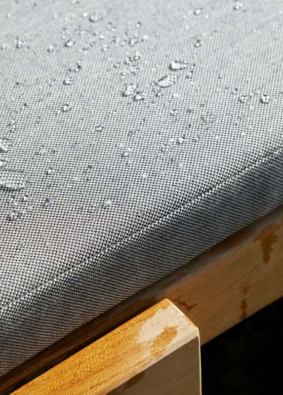 Stoffet er i stand til at modstå vind og vejr og materialet er Øko-certificeret og ekstremt farve- og lysægte samt vand- og smudsafvisende og endda mug-resistent. Puden tørrer exceptionelt hurtigt, selv efter et kraftigt regnskyl, da skummet har en åbencellet struktur, der tillader både vand og luft at passere igennem. Inden du skal bruge liggestolen og den er våd, sætte du den på højkant og så er den klar efter en lille time. Skummet har en fast og komfortabel fylde, der forbliver den samme år efter år.