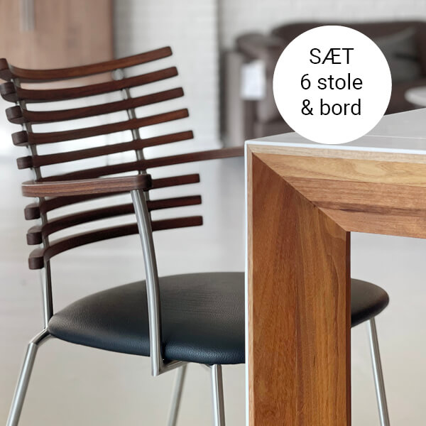 Sættet består af: Spisebord + 6 armstole i valnød.