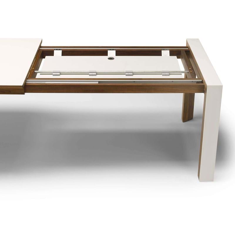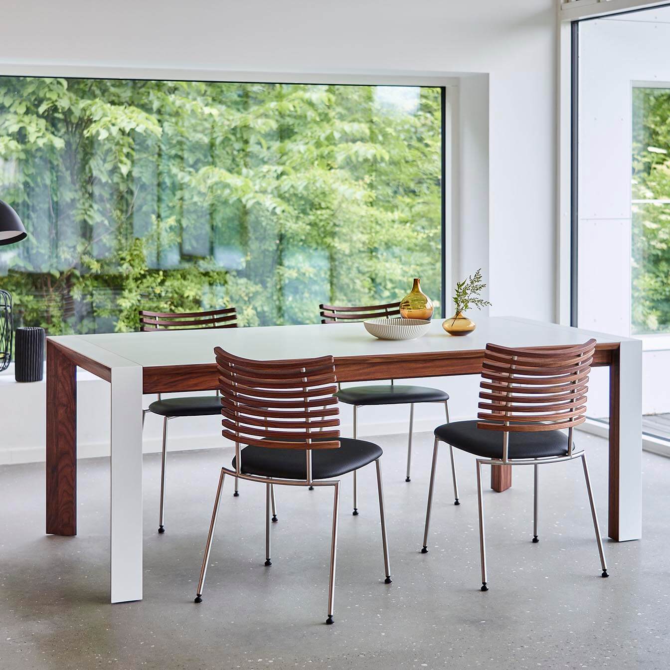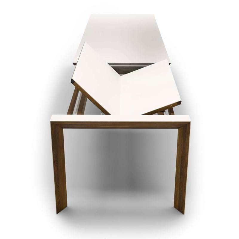 Langbord (GM7720) med hvid Corian®. Benbukkene beklædt med hvid Corian®. Bordet er udstyret med 1 butterfly-tillægsplade på 100 cm med hvid Corian® top, som er integreret i bordet. Man kan nemt betjene udtrækningen ene mand og 100 cm. giver 4 ekstra siddepladser (2 på hver side).