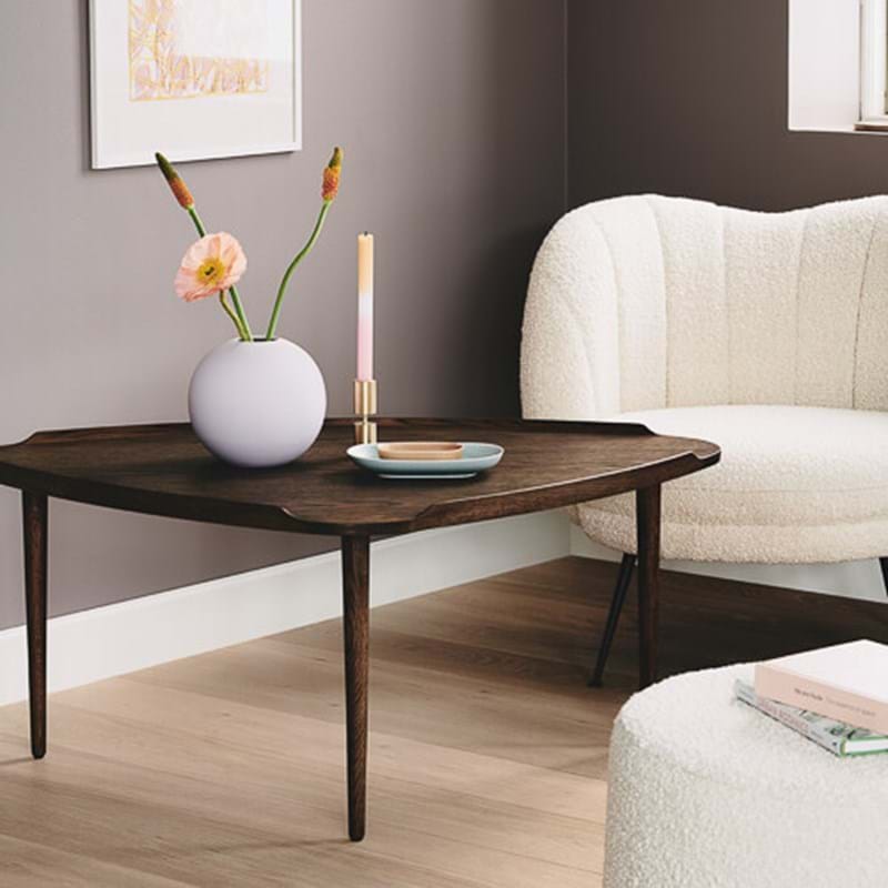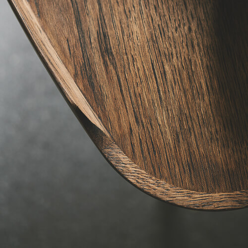 Bordplade i 4 mm. finér. Kehletkant og ben i massiv eg. Fås i tre olietyper: dette røgbejdset eg olie, eg olie natur og hvidolieret eg. Findes her på shoppen.