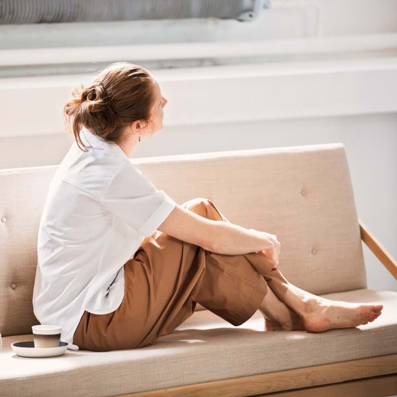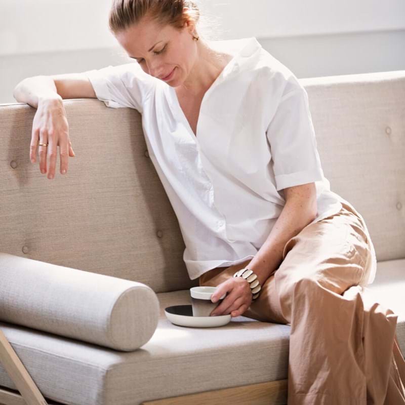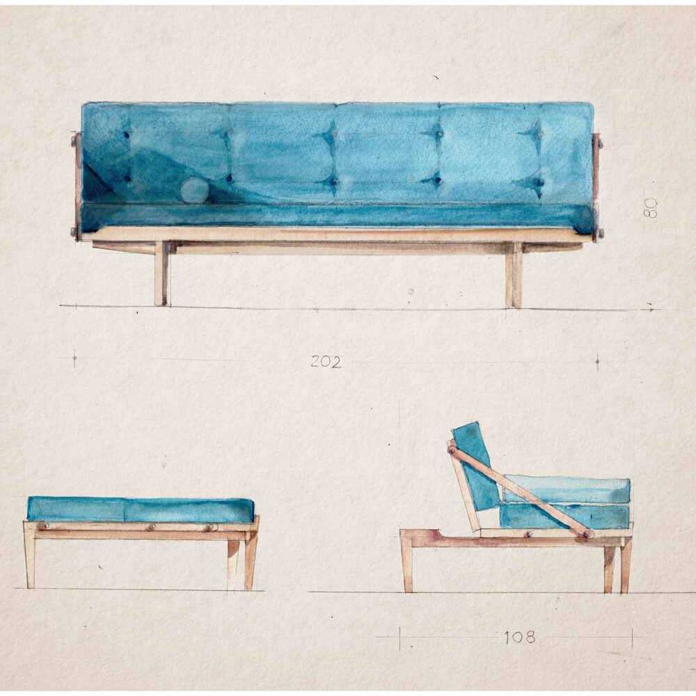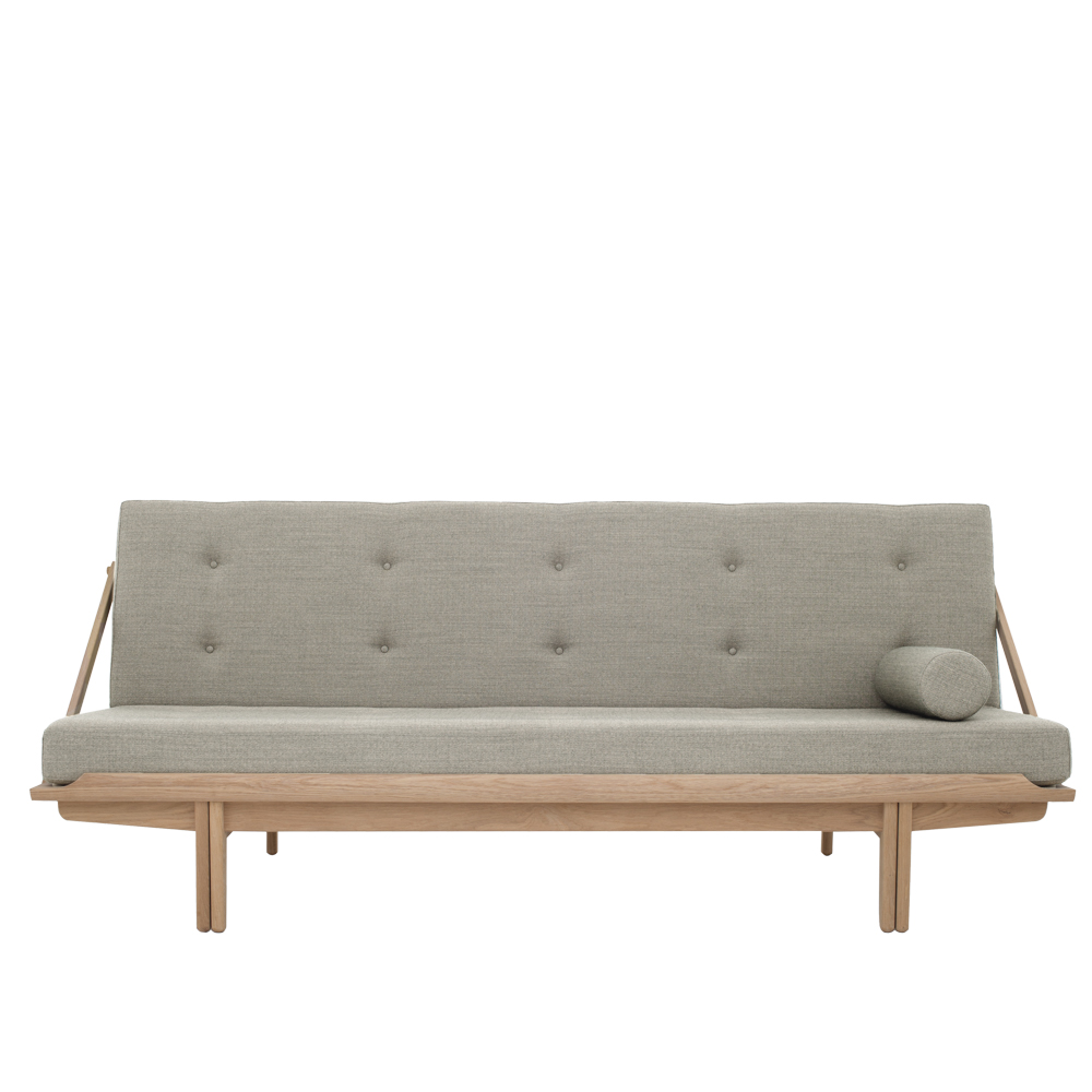 Poul M. Volther designede denne daybed i 1958. Rammen er i massivt træ og med fine detaljer. Den komfortable madras viser vi i stof. Men ved henvendelse til butikken kan den også beklædes med læder.