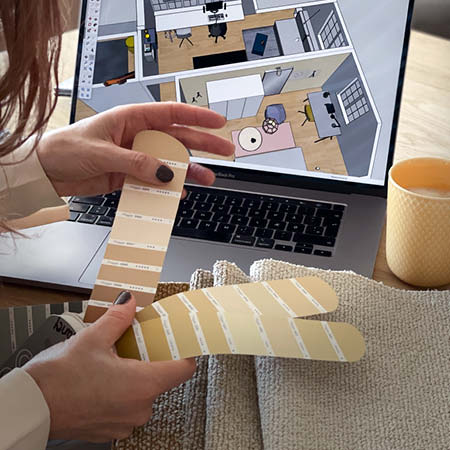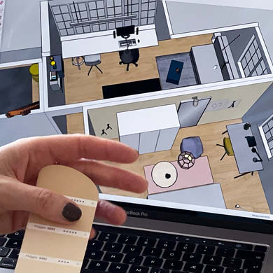 Online: Når oplægget/ene på din kommende indretning er udarbejdet, sender jeg præsentationen med udførlige beskrivelser på, hvad der ligger til grund for mine valg samt guide på alt hvad der bruges af interiør. Der er uførlige billeder og beskrivelser på farve, materiale og størrelse på det forskellige interiør. Og så vidt det er muligt at fremskaffe prøver, fremsendes disse. Vi kan sagtens tale i telefon eller afholde et online møde efterfølgende, for at I kan få uddybet, besvaret spørgsmål eller hvis I ønsker noget ændret.